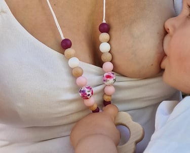 Aquí es donde los collares de lactancia y porteo de Los Mofletes de Mamá se convierten en tus aliados inseparables: